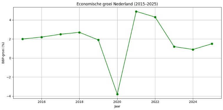 De Nederlandse economie heeft tussen 2015 en 2025 een grillig verloop gekend. Na een stabiele groei in de periode 2015–2019, zorgde de coronapandemie in 2020 voor een scherpe krimp van het bruto binnenlands product (BBP). De daaropvolgende jaren lieten een krachtig herstel zien, maar recente jaren kenmerken zich door afzwakkende groei als gevolg van geopolitieke spanningen, energieprijzen en afnemend consumentenvertrouwen.