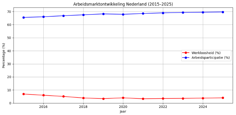 De werkloosheid is sinds 2015 gestaag gedaald, met een tijdelijke stijging in 2020. Tegelijkertijd is de arbeidsparticipatie toegenomen, mede door vergrijzing en beleid gericht op activering. Toch blijft de arbeidsmarkt krap, vooral in sectoren als zorg, techniek en onderwijs.