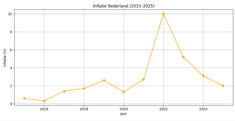 De inflatie is in de periode 2021–2023 sterk opgelopen, met een piek van 10% in 2022. Deze stijging werd veroorzaakt door verstoringen in de energie- en grondstoffenmarkten. Sindsdien is de inflatie gedaald, maar blijft deze boven het langjarig gemiddelde.