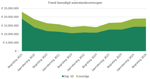 Naast de 10 grootste financiële risico's is er sprake van overige risico's die opgeteld een financieel risico vormen van € 4.745.000 (begroting 2025: € 4.105.000; jaarrekening 2024: € 4.695.000). Het totaal benodigde weerstandsvermogen (dit is het totale bedrag aan financiële risico's) bedraagt daarmee € 19.020.000 (begroting 2025: € 16.730.000; jaarrekening 2024:
